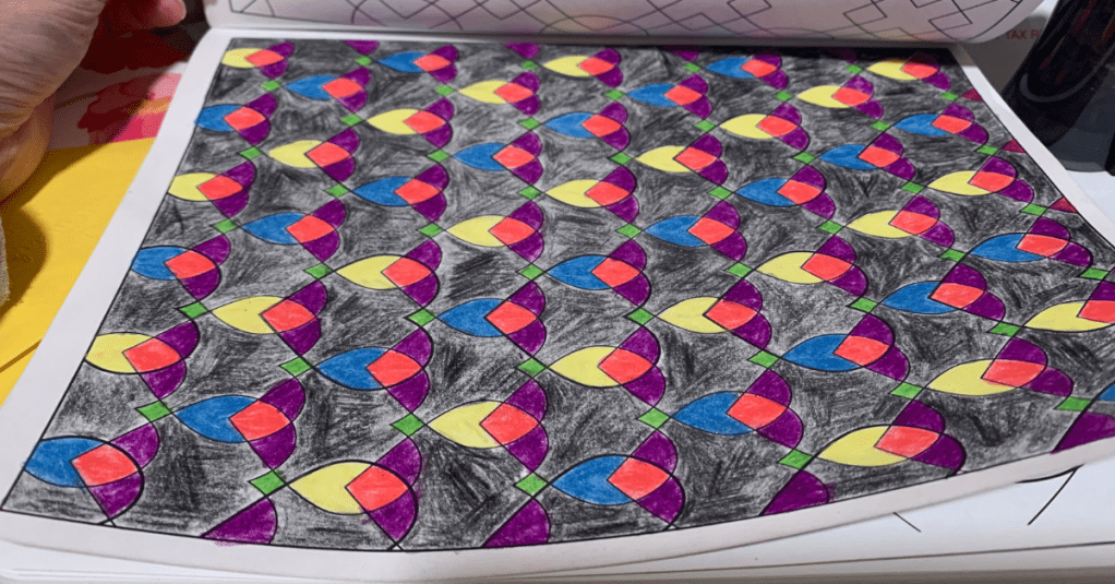 I flipped through the pre-drawn designs and landed on a page with intertwining hearts. How poetic. Let’s color all the hearts black. And I did. Each heart had a center section and I decided to color every single one black.